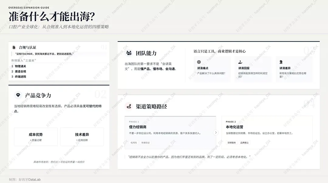 不会。牙医的工作环境很复杂——在牙医为中心、4到6平方米范围内,需要的是一整套工具和材料的系统配合。出海也一样,你不能指望靠一个产品、一次展会、一个大客户就"成功"。你需要的是一套系统性的策略:产品+法规+团队+渠道+本地化。